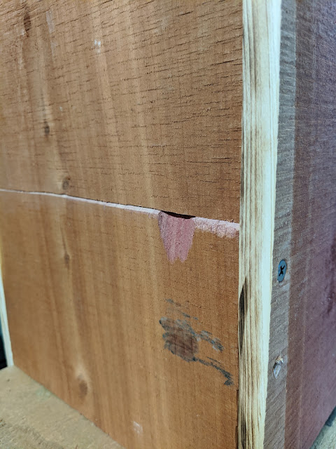 It's not bad for a first attempt with thin, scrappy boards. I must admit that I really love the color of the cedar boards. I know the wood will last virtually forever, but since it is so thin I hope it doesn't warp too badly in the weather. We'll see.